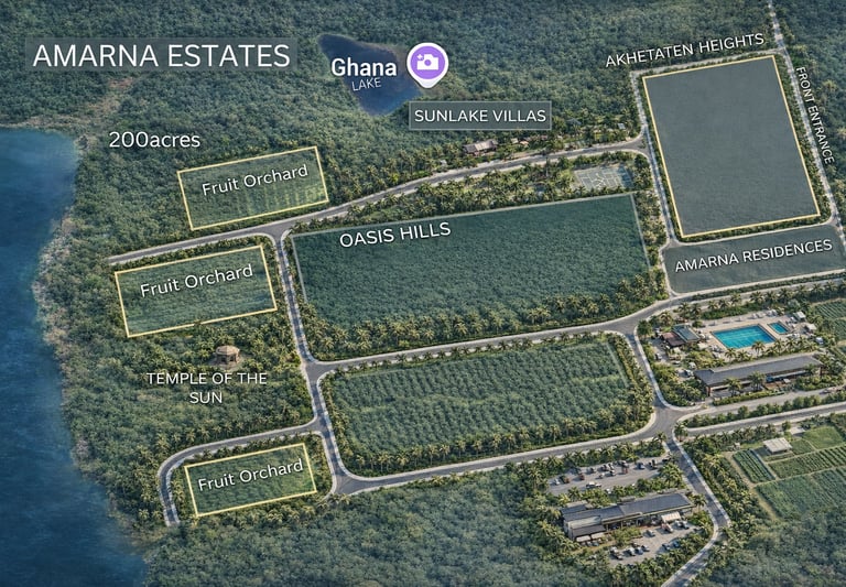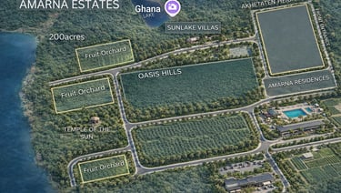 Situated on a breathtaking 200-acre elevated plateau in Ghana’s Volta Region, New Las Vegas Amarna Estate is a master-planned gated community that fuses eco-luxury living, digital real estate innovation (NFTs), and sustainable development. Bordered by the serene River Dayi on one side and featuring its own private lake, this visionary development offers a rare blend of tranquility, opportunity, and futuristic living.